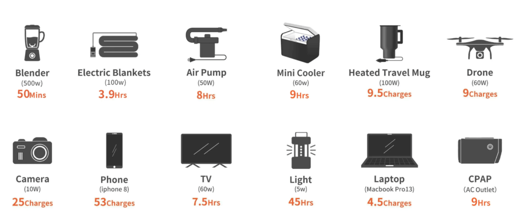 Con el Jackery 500 se pueden alimentar dispositivos como luces, computadoras portátiles, teléfonos, un refrigerador pequeño, un CPAP y otros dispositivos en caso de una interrupción de energía eléctrica. Además, también se puede utilizar para alimentar aparatos como licuadoras, asadores de pellets, proyectores y herramientas mientras se disfruta del aire libre.
